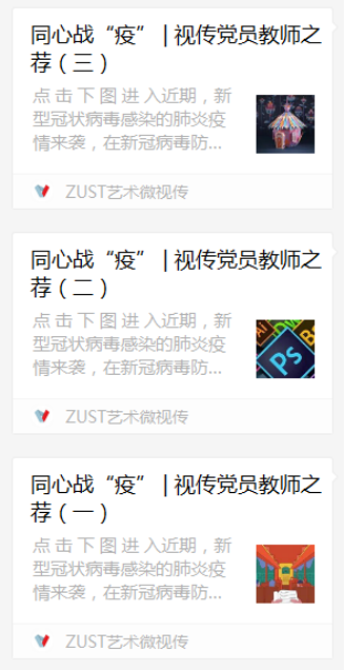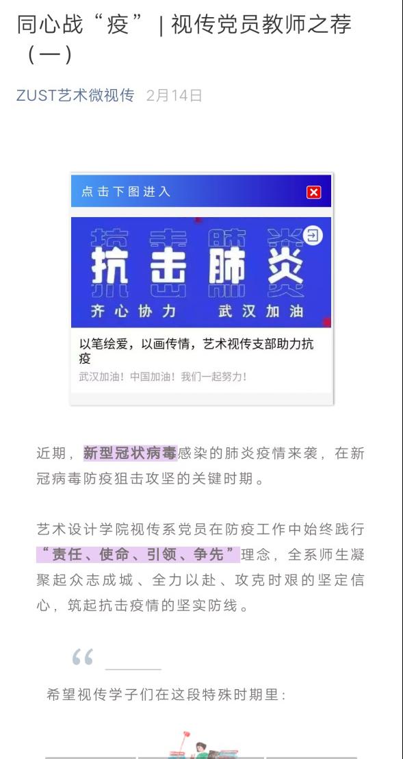 停课不停学,阻断疫情和督促学习两不误。214日,支部希望同学们能在这段特殊的时期内,充分做好学习的准备,锻炼自学能力,特支部叶玲红、彭亚丽、杨列辉、王恺文、吴萍、诸佳老师自发利用假期为视传学子们联合制作了教师推荐书目给学生线上指导。推荐书目特分三次推文发出,分别是艺术理论学习推荐、软件技术学习推荐、手工制作学习推荐,干货感满满,为学生提供安全可行的方式方法学习专业知识,同时希望同学们能够利用好网络媒介提高学习效率,,凭借着艺术的创造与传播战“疫”,献出自己的一份力。