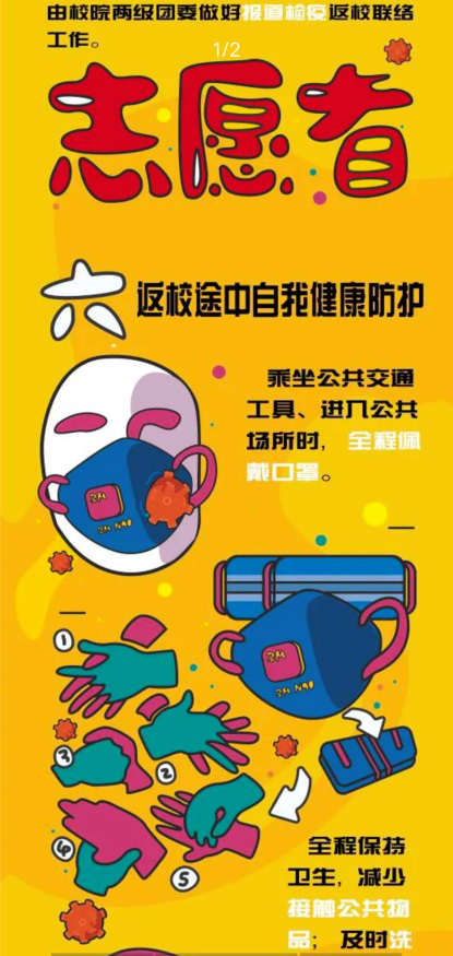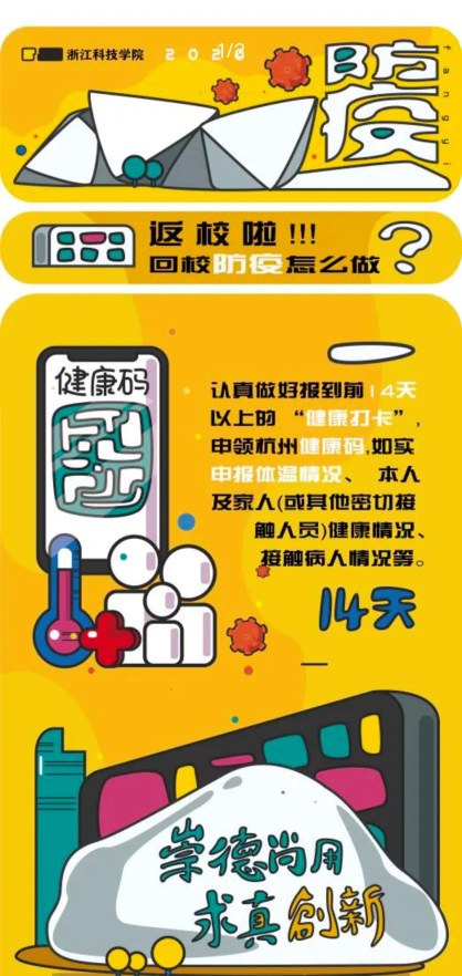 做好校园疫情防控,打赢常态化疫情攻坚战。返校在即,为确保开学复学各项防控措施能够落实到位,425日,支部诸佳老师指导学生联合校学生处绘画了《报道须知:返校前需要准备些什么?你想知道的都在这里》长图插画,将返校注意事项生动形象化,一经发出便获得了前所未有的8000多阅读量,为疫情之下同学们复学工作做足准备。514日、515日,为配合学校的本科生回校工作,支部老师叶玲红、彭亚丽、吴霄坚、杨勇、吴萍、诸佳老师纷纷参与到返校志愿者的工作当中,为学生返校进行紧张忙碌的入校资格审查、体温检测,有效筑牢疫情防控基础,促进学校防疫工作整体水平的提升。在后续复学之际,党支部提出疫情防控绝不松懈,依然要秉承初心,育才造士与疫情防控相结合。在19级品牌设计12班的《装饰绘画技法与表现》课程中,诸佳老师便以疫情命题,鼓励学生拿起画笔思考在校园、生活中,为学子搭建的臂弯。同学们在老师的指导下用材料搭建一幅幅疫情记忆,在这其中也铭记国家和社会的重托。