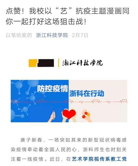 文艺宣传“轻骑兵”,凝聚力量助力抗疫。在这场没有硝烟的战争中,全国人民都在以各种方式支援灾区,抗击病魔,教工第二党支部也抢早争先,与时间赛跑,在接到学校组织部通知的当天,第一时间成立应对疫情工作领导小组。于131日,由支部诸佳老师组织并指导,用最短的时间带领视传系学生支部学生党员制作出一批疫情宣传海报。海报通过微信公众号的形式推送给居家隔离的浙科学子和广大网民,成为浙江省最早一批疫情支援海报,并得到学校官方报道,希望以此鼓舞斗志、抚慰心灵,为武汉人民、医护人员及各救援队伍送去强有力的鼓励与支持。此次宣传海报主题为“以笔绘爱,以画传情,助力抗疫”,结合专业所长,用图像和文字语言表达抗击疫情的坚定信心。27张海报分别以《取消聚会,平安过年》、《带口罩抗击疫情》、《支援》、《在家活动》、《拒绝野味》等主题进行设计,及时做好疫情思想宣传、疫情防护指导,具有突出的针对性和时效性,充分发挥了文艺宣传“轻骑兵”的作用。