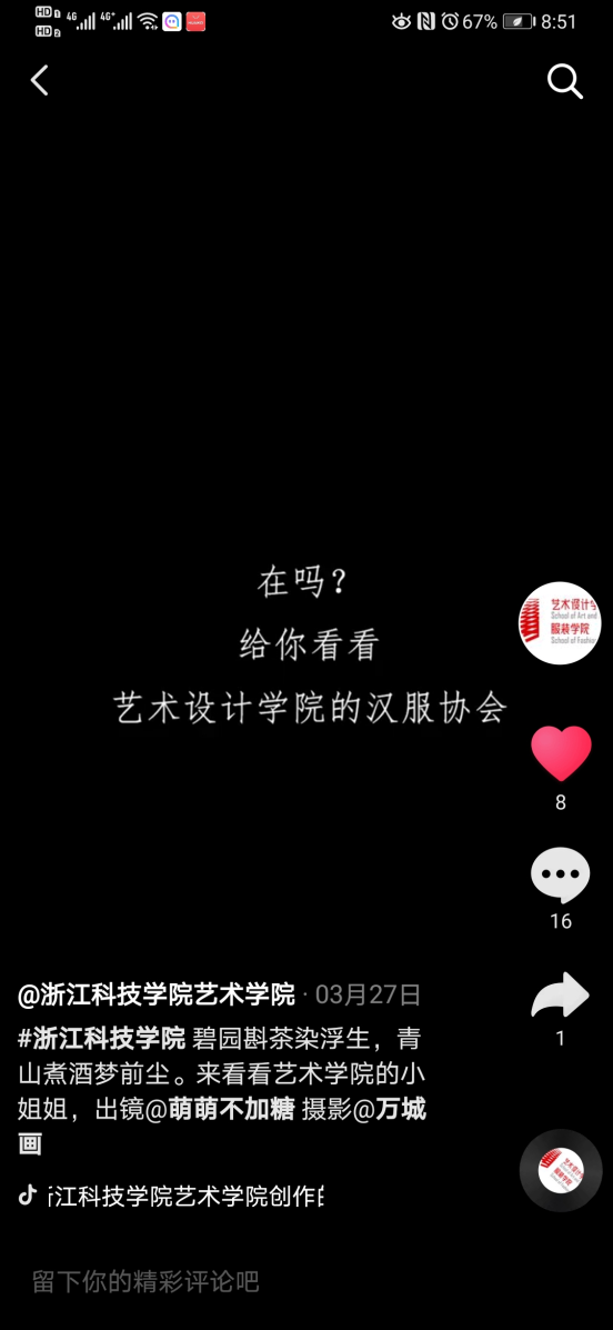 近期,艺术学院团委深入摸底调查发现抖音、快手等短视频APP在学生群体的使用率达40%以上。针对艺术学院动画、摄影、视觉传达等专业特色,艺术学院团委积极组织,创建了一支短视频运营团队,在抖音APP上注册了“浙江科技学院艺术学院”官方抖音账号。 一直以来,艺术学院团委都很重视大学生各方面创新发展,此次创建抖音团队,一方面希望能努力挖掘和培养短视频制作、运营的特色人才,另一方面也是意在通过一个全新的更加广阔的舞台,鼓励同学们通过短视频展现自己,更是能以一种更直接的方式让同学们及时了解到校园动态,丰富同学们的校园生活。