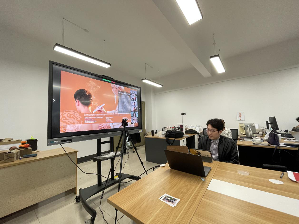 本次工作坊由德国柏林HTW设计学院院长Katrin Hinz教授和艺术学院工业设计系主任卢艺舟教授共同主持,德方教师Bianca Koczan、胡奚及我校教师裘航、朱吟啸、魏杭帅、张叶知共计六位老师协助指导和翻译。共有5名来自HTW工业设计专业的学生和20名我校工业设计系的学生参加了此次主题为“智能+暖”的设计项目。在三周内,双方学生以小组形式紧密合作,在线确定设计方向,接受Katrin Hinz院长和Bianca Koczan博士关于设计思维和方法的指导训练,高效运用Miro等在线软件进行头脑风暴和创意迭代,在教师团队的指导下不断完善产品方案。在此次学习交流中,师生们放弃了节假日的休息时间,克服时差问题,高效、高质量地完成了五款设计方案,分别是“Very Hot Banana”小组的MOXA智能艾灸套装、“SUNLIGHT”小组的救援小蟹、“Gold Miners”小组的智能油漆墙体烘干机、“Black Hole”小组的智能失温救助装置以及“Kartoffelpuffer in a Hot Pot”小组的厨房墙壁油污清理器。