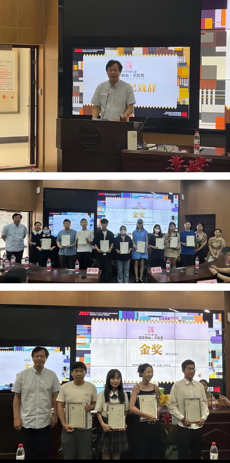 6月16日上午,艺术学院举行第七届创意和山·学院奖颁奖仪式,学院领导班子及各系室中心主任参与。詹俊书记发表致辞,激励学生以设计服务社会经济文化发展,未来取得更丰硕的成果。学院领导及专业负责人、系主任等为获奖本科生、研究生颁奖并合影。学院连续七年举办该项赛事,从各专业方向毕设中遴选优秀作品,颁发证书与奖金,体现了学院在双创育人、培养高水平设计创新人才方面的积极探索与努力,这项评比也在学院各年级学生中发挥了榜样力量。