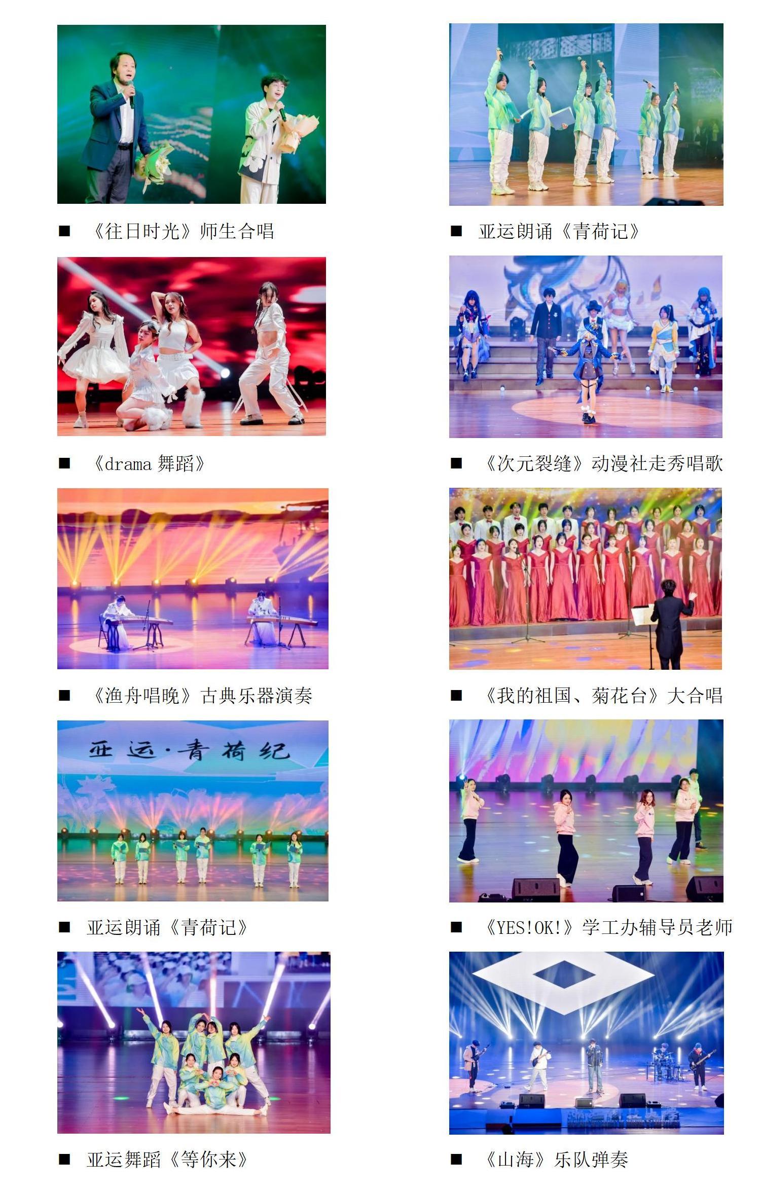 晚会通过聚焦《撩弦吟唱,“艺”气飞扬》、《亚运盛会,“艺”熠生辉》、《青春永驻,“艺”气风发》三个篇章,集舞蹈、器乐、歌曲、朗诵、走秀、大合唱等形式为一体,节目种类丰富形式多样,充分展现学院专业特色和青年学子青春、积极、向上的精神面貌,为观众带来一场视听盛宴。