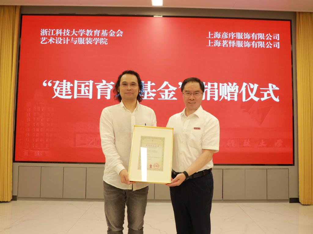 5月25日上午,“建国育才基金”捐赠仪式举行。艺术学院1997级服装艺术设计校友、上海彦序服饰有限公司总经理陈建国向学校捐赠400万元人民币,设立建国育才基金。校党委书记赵东福、校党委副书记张日向出席,学校办公室、党委学工部、校教育基金会、艺术学院负责人和师生代表参加捐赠仪式。