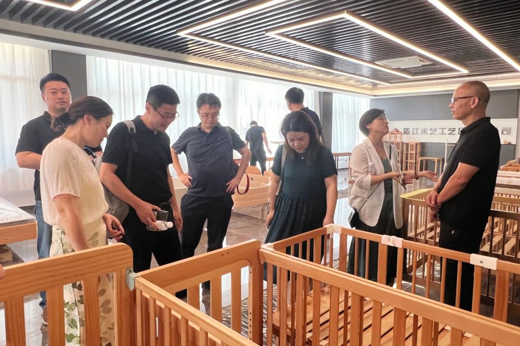 浙江木艺工艺品有限公司负责人叶德敏为团队介绍木制儿童床系列产品